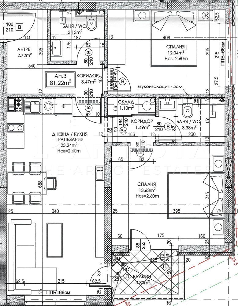 It consists of: entrance hall/2.72 sq.m./, corridor No. 1/3.47 sq.m./, corridor No. 2/1.49 sq.m./, living room with kitchenette/23.24 sq.m./, bedroom No. 1 /13.63 sq.m./, bedroom No. 2/12.04 sq.m./, bathroom with toilet No. 1/3.13 sq.m./, bathroom with toilet No. 2/3.38 sq.m./, storage room/1.10 sq.m./, shared balcony /3.80 sq.m./. South exposure.