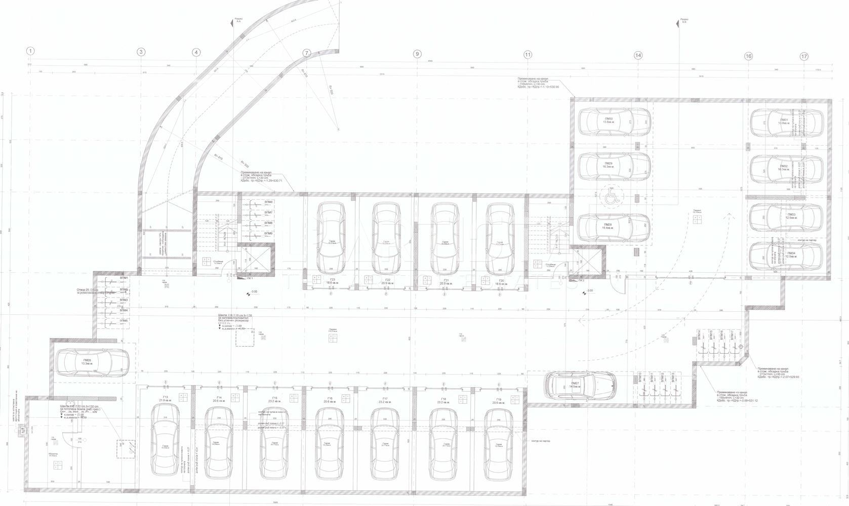 The garage has a built-up area of 20.90 sq.m./48.44 sq.m. with the common areas/. Width of the garage - 2.95 m, length - 5.55 m.