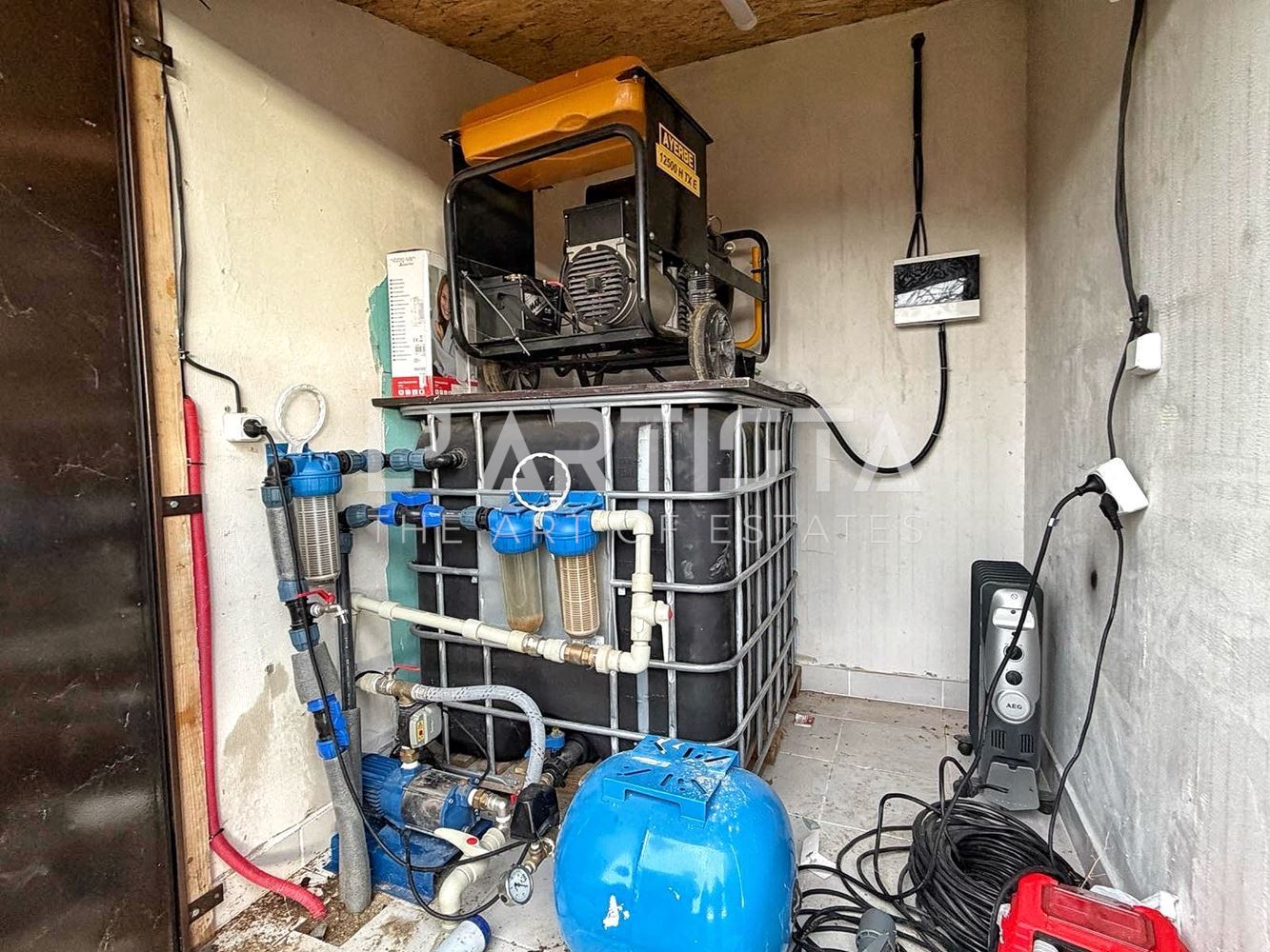 Water is supplied through a well and a purification system. Wastewater is disposed of in a septic tank.