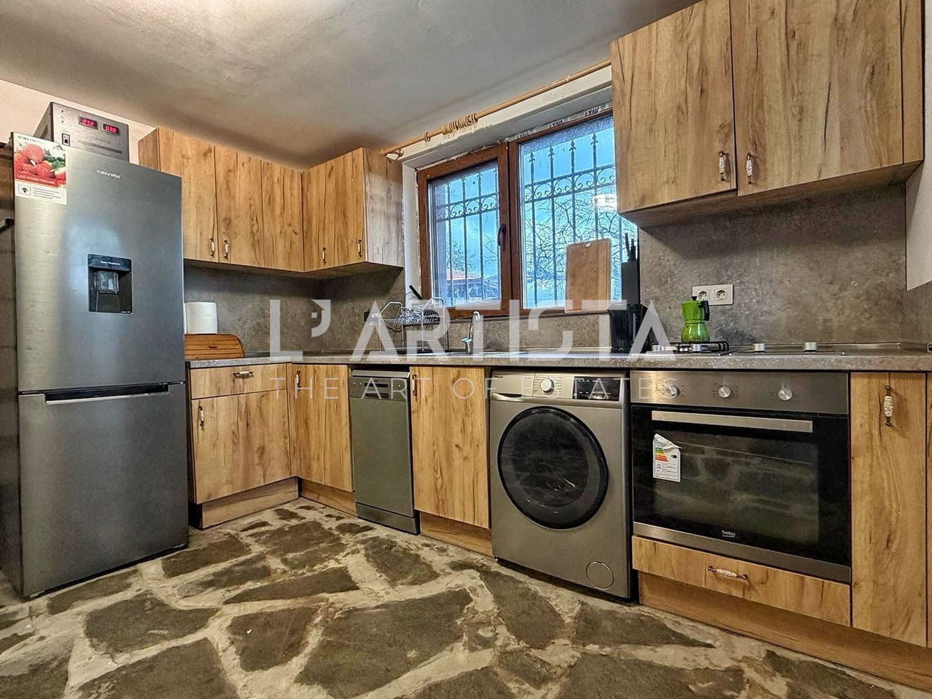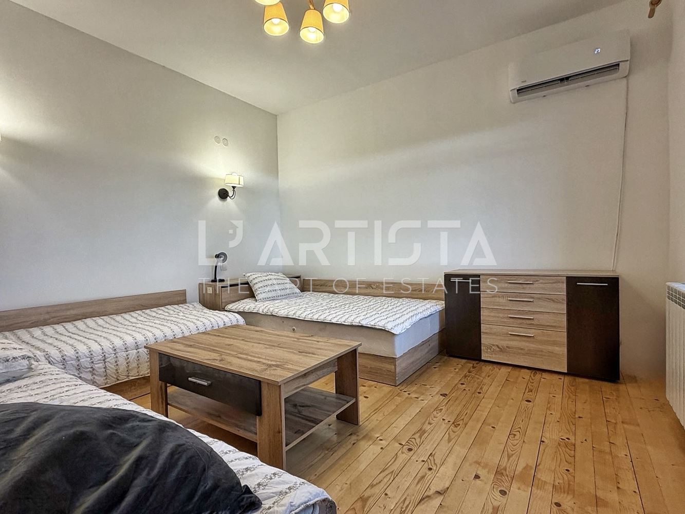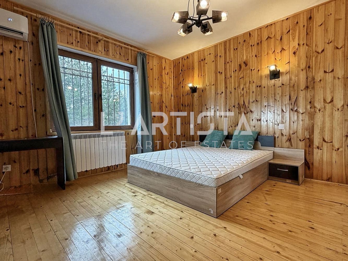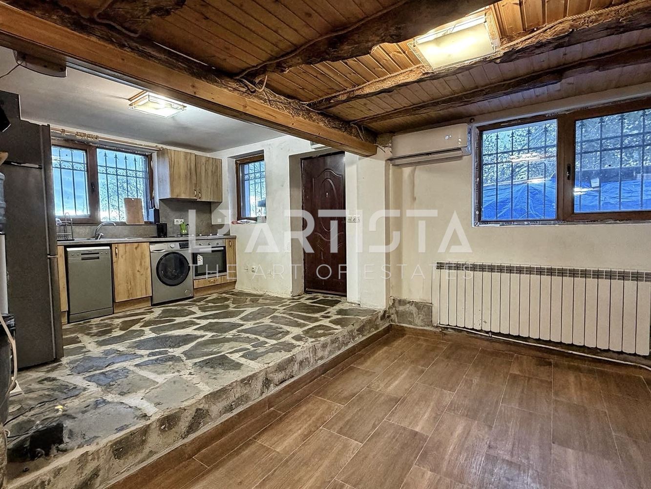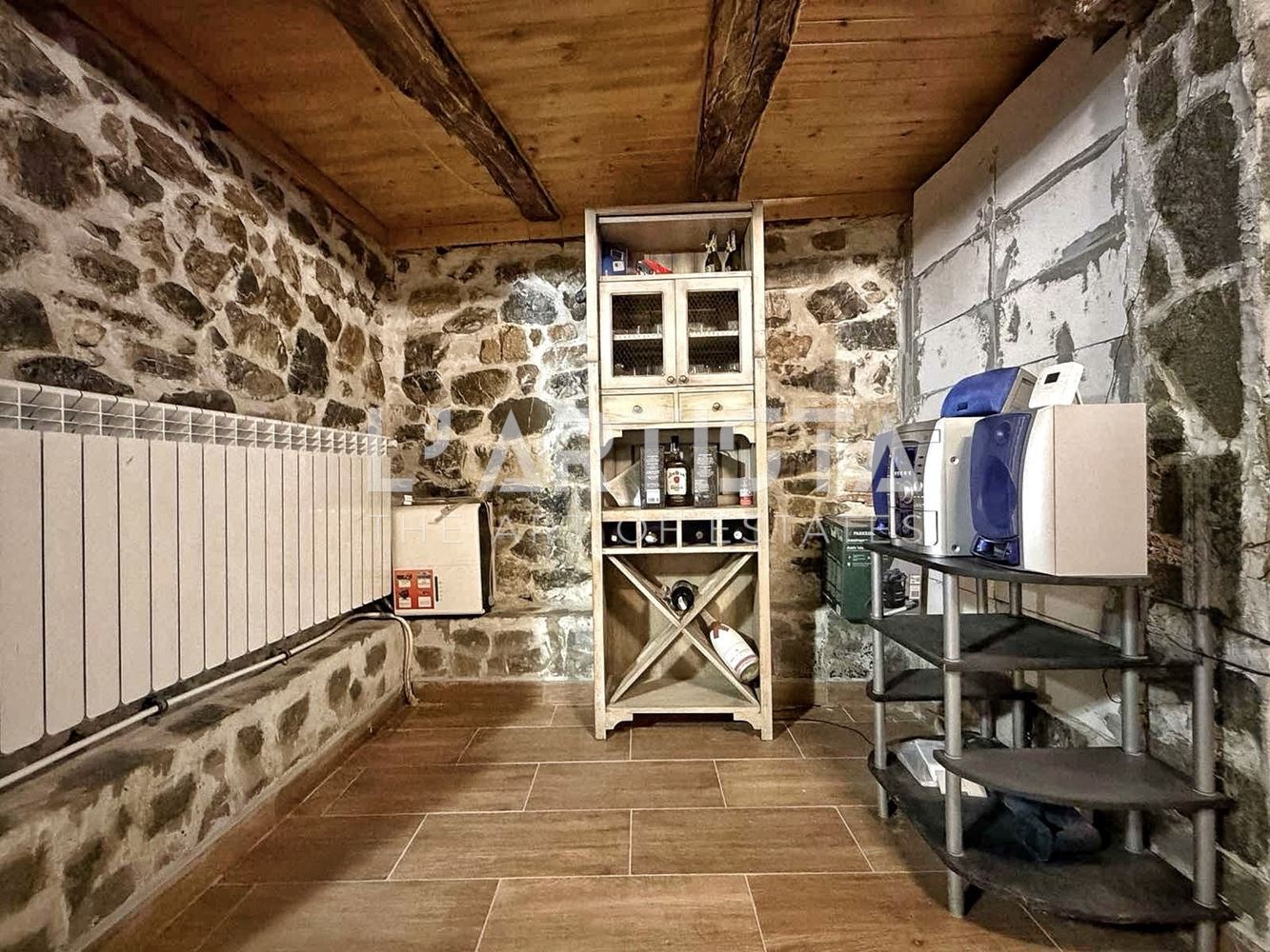 It is heated by electricity – air conditioners, a wood-burning fireplace, and a separate pellet boiler.