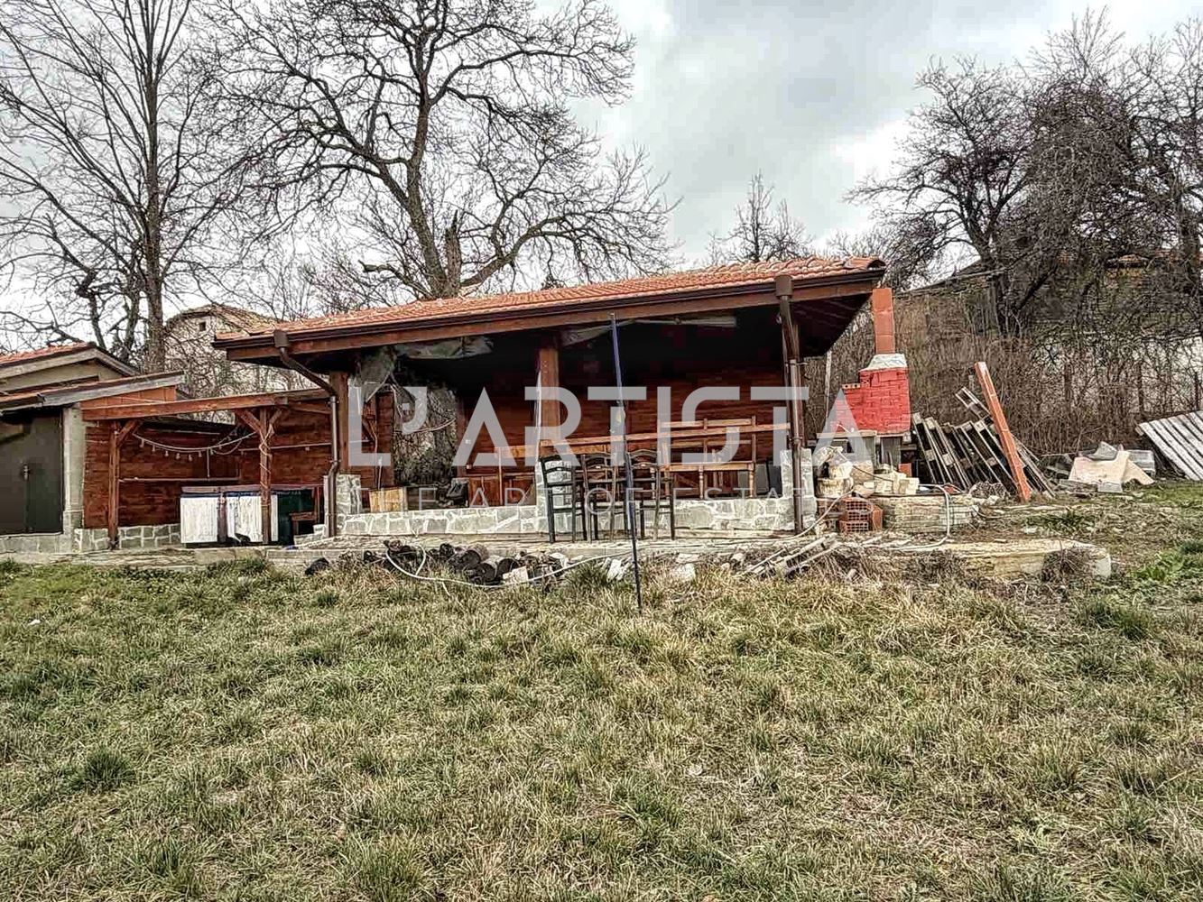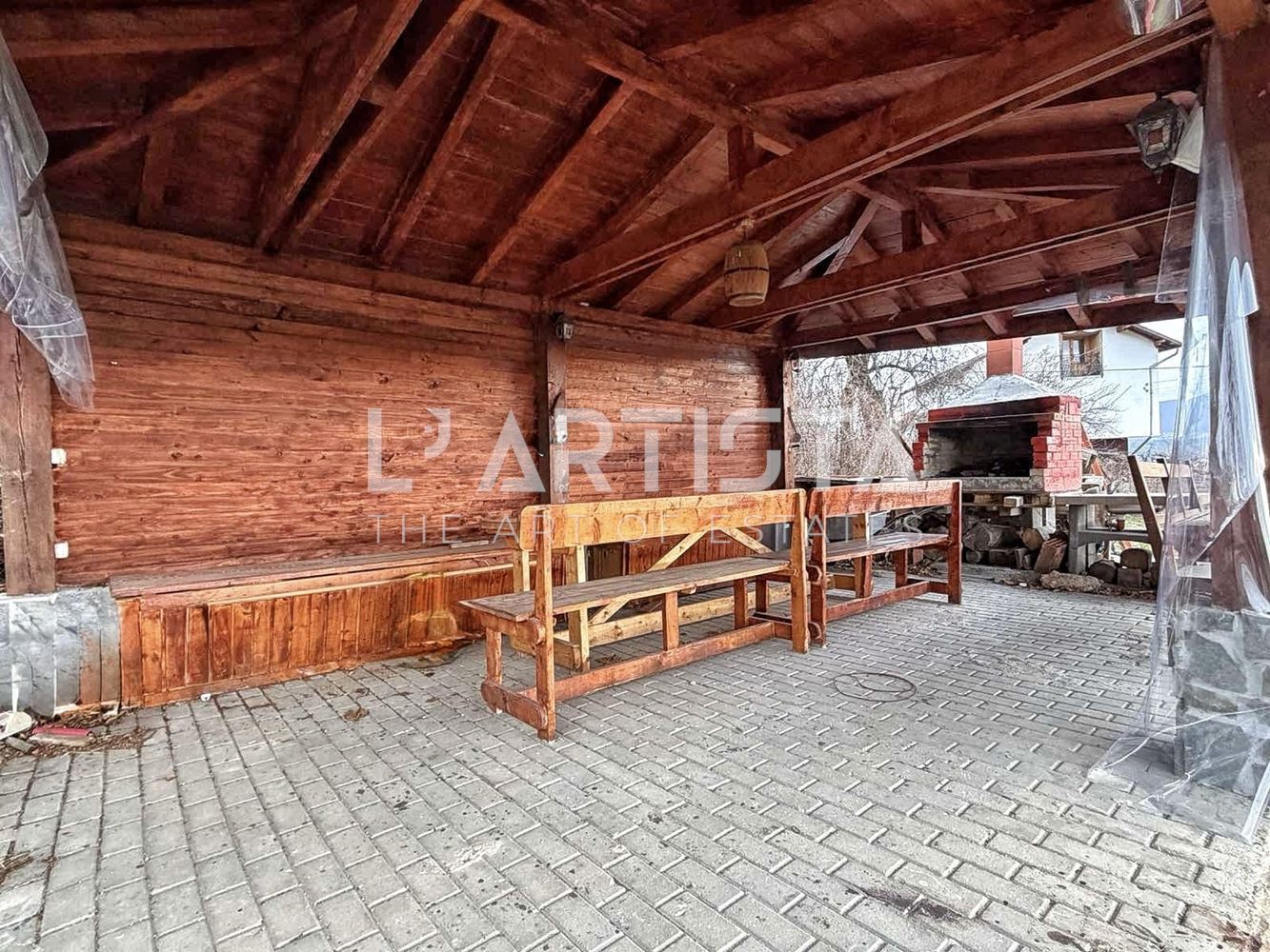 The yard is level across 99% of its area. It features: an outbuilding suitable for additional sleeping accommodations, storage, a fitness area, etc.; an outdoor hot tub; a BBQ area for 20+ people with a wooden canopy; and for the colder months, two gas heaters are available, and the area is enclosed with clear vinyl panels.
