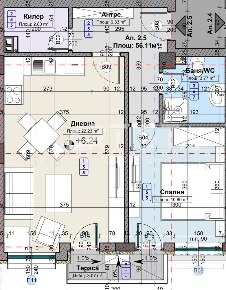 Жилището се предава на фина мазилка и замазка,хоризонтална и вертикална инсталация до тапа; монтирана блиндирана входна врата.