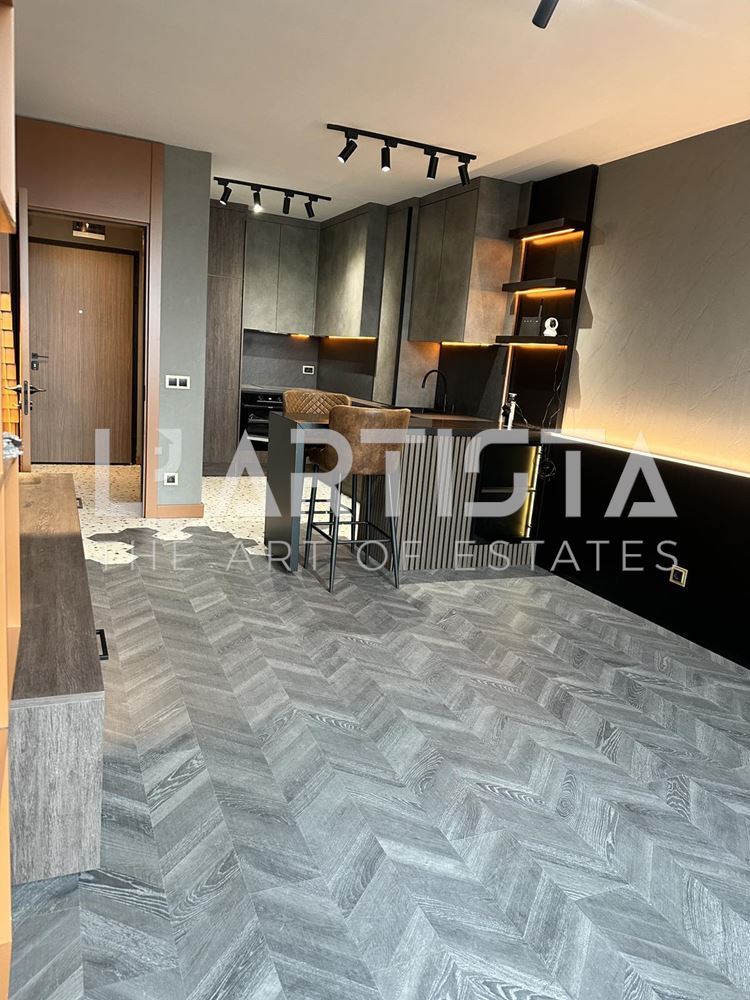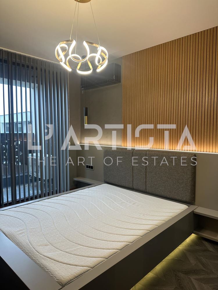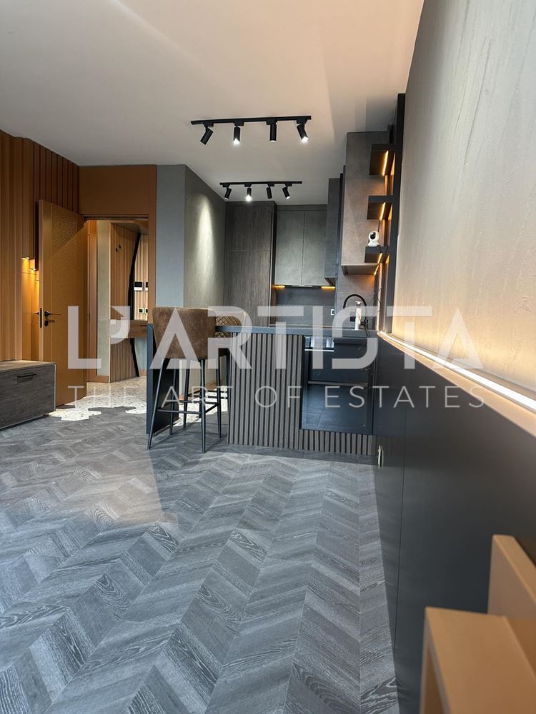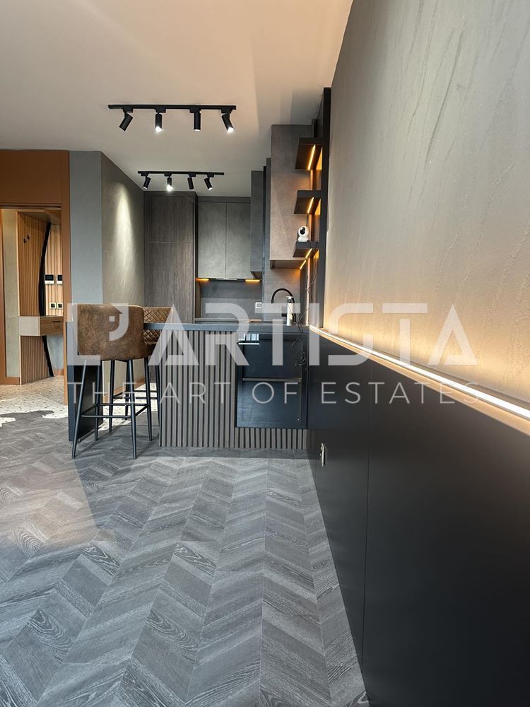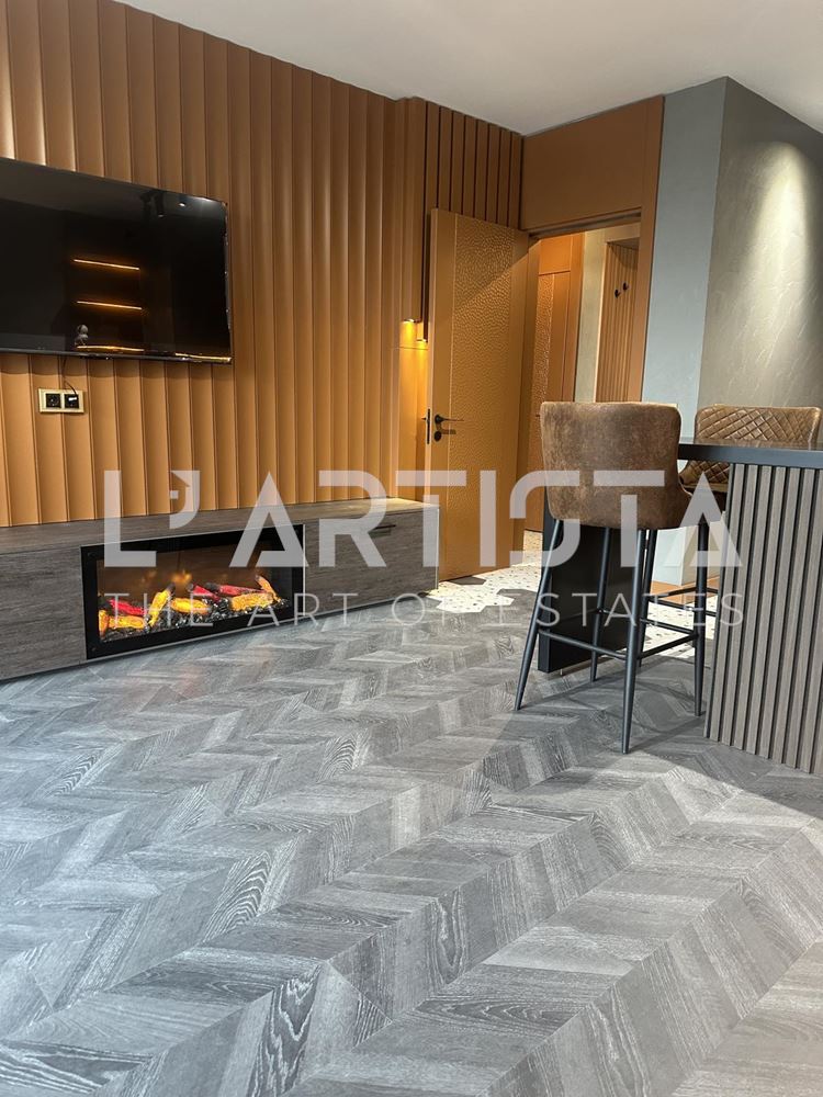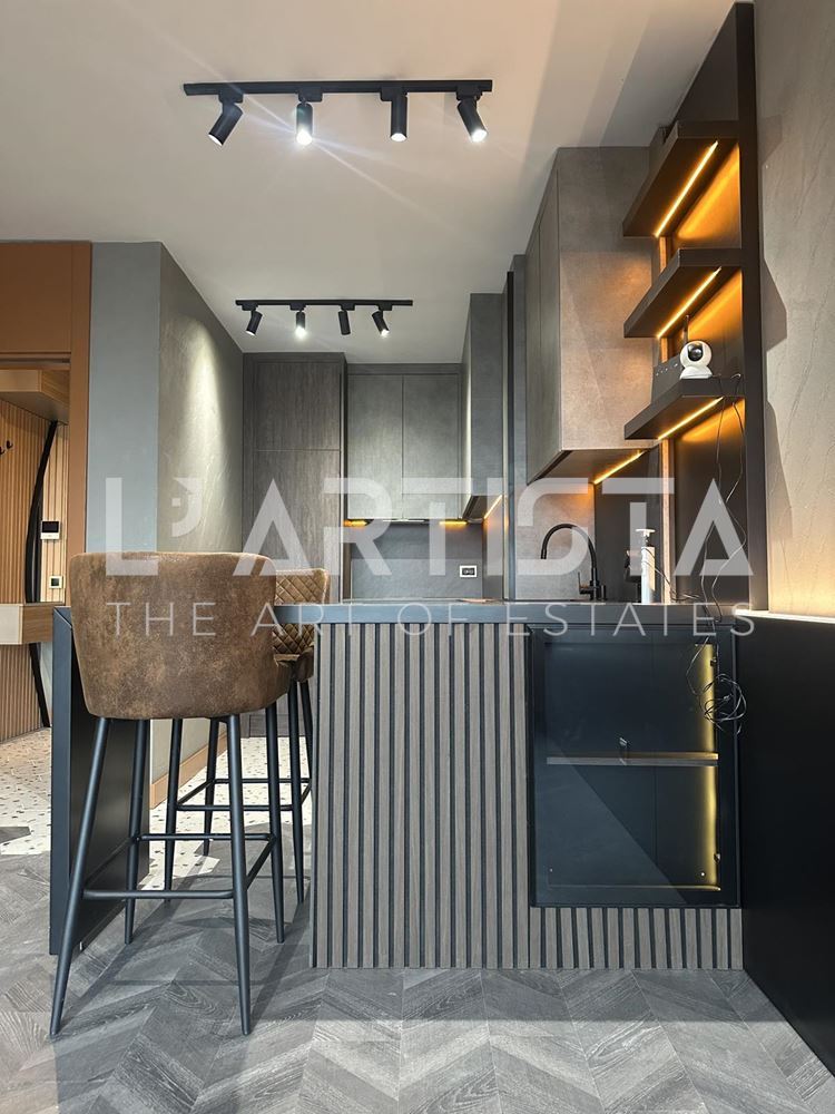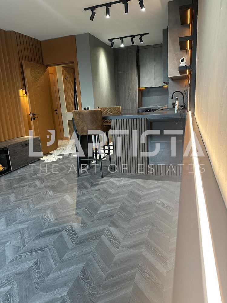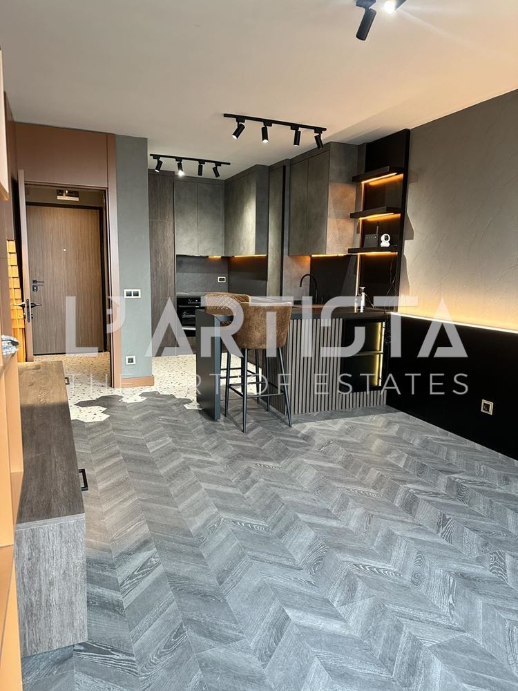 Разпределението е функционално и добре организирано, като включва просторен хол с трапезария и кухненски бокс, самостоятелна спалня, баня с тоалетна, мокро помещение и тераса. Апартаментът се предлага напълно обзаведен и оборудван с висок клас мебели по поръчка, съчетани с модерни дизайнерски решения, декоративни мазилки и стилно LED осветление, създаващи уютна и елегантна атмосфера.