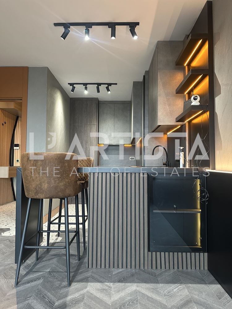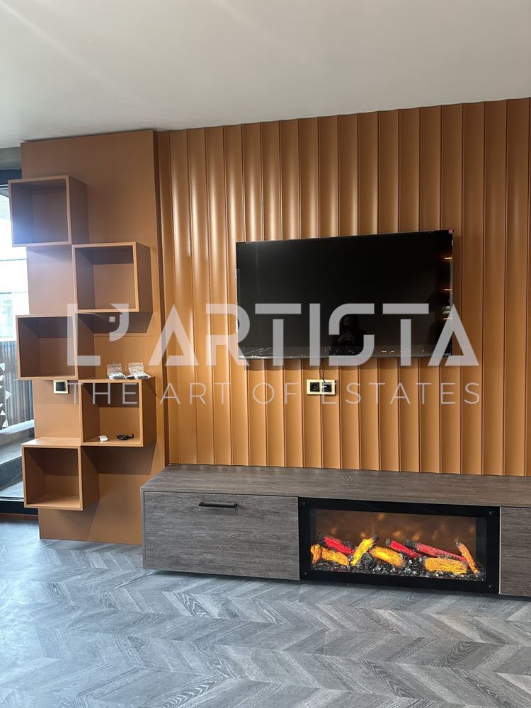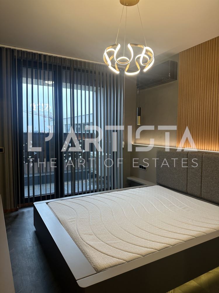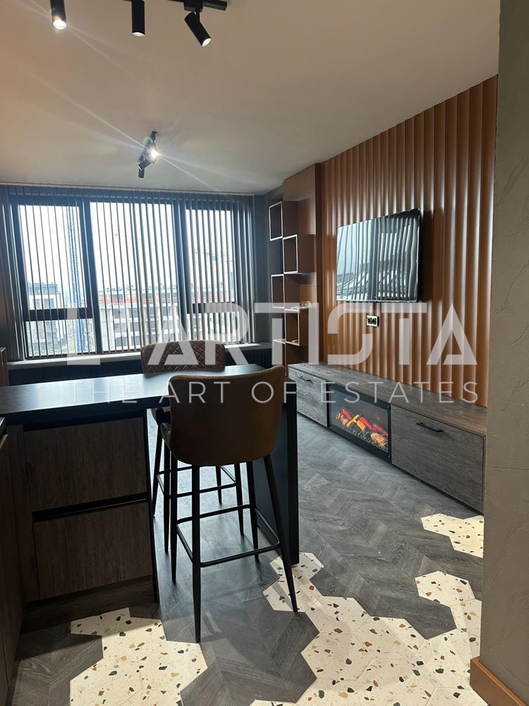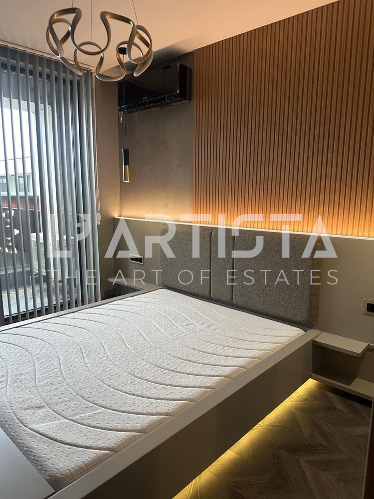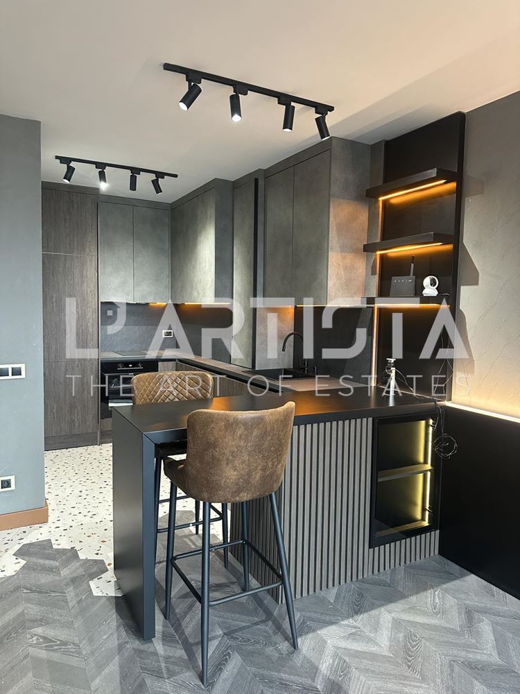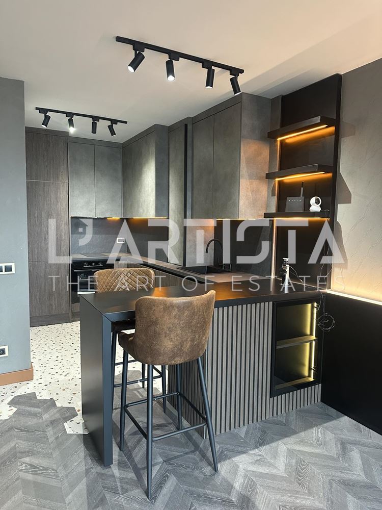 Разпределението е функционално и добре организирано, като включва просторен хол с трапезария и кухненски бокс, самостоятелна спалня, баня с тоалетна, мокро помещение и тераса. Апартаментът се предлага напълно обзаведен и оборудван с висок клас мебели по поръчка, съчетани с модерни дизайнерски решения, декоративни мазилки и стилно LED осветление, създаващи уютна и елегантна атмосфера.