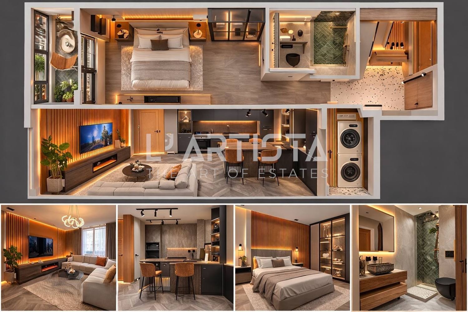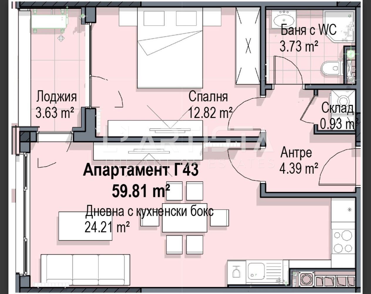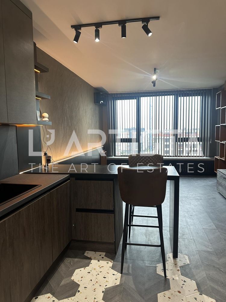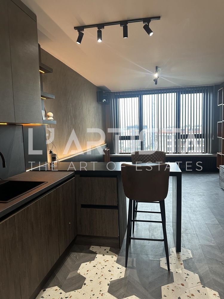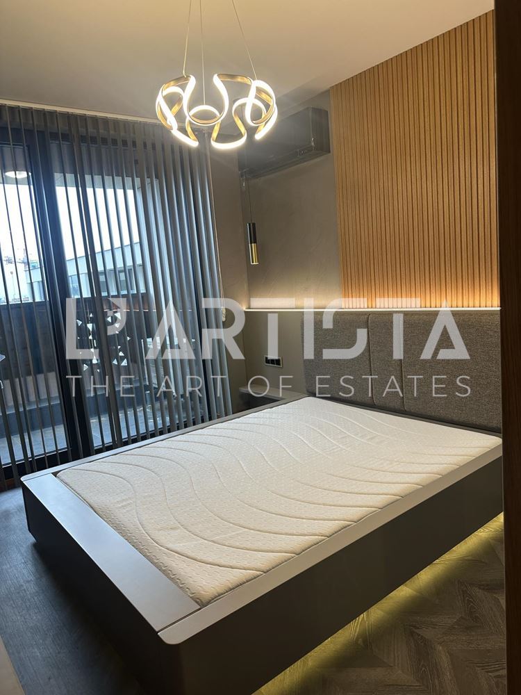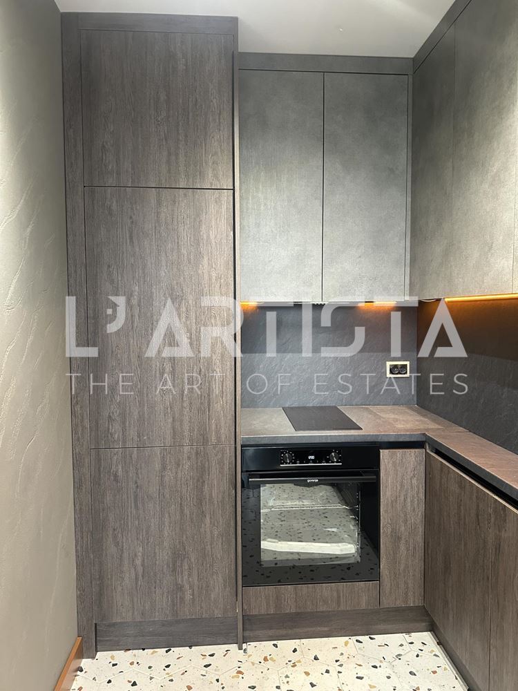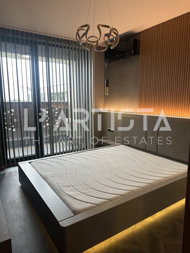 Разпределението е функционално и добре организирано, като включва просторен хол с трапезария и кухненски бокс, самостоятелна спалня, баня с тоалетна, мокро помещение и тераса. Апартаментът се предлага напълно обзаведен и оборудван с висок клас мебели по поръчка, съчетани с модерни дизайнерски решения, декоративни мазилки и стилно LED осветление, създаващи уютна и елегантна атмосфера.