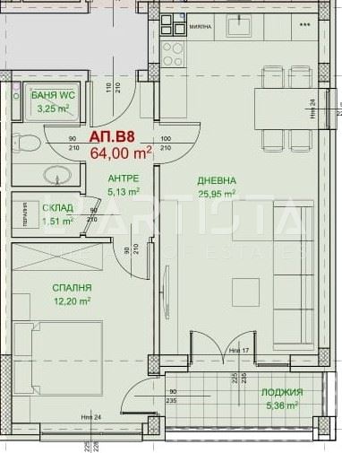Двустаен тухлен апартамент №В8 със застроена площ от 64.00кв.м.(74.98кв.м. с общите части).