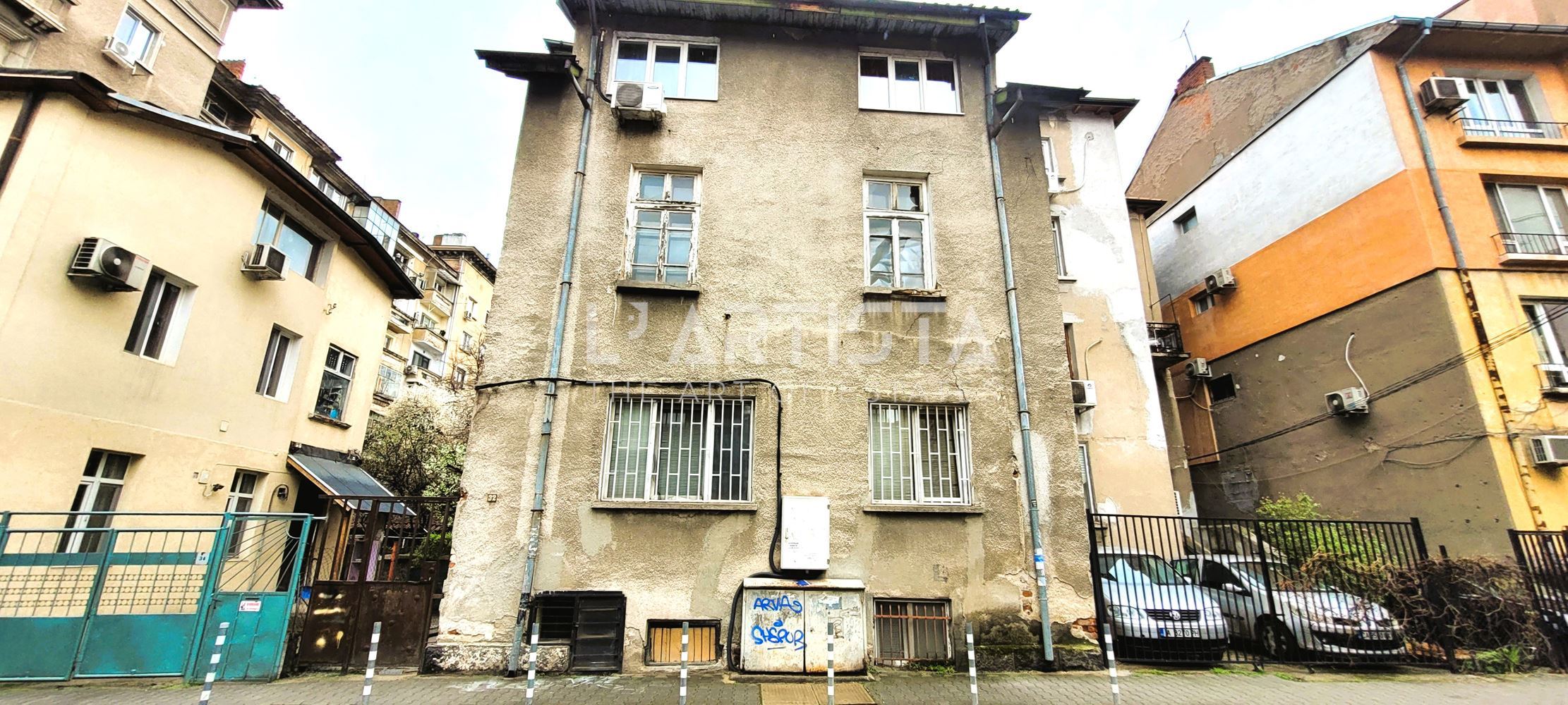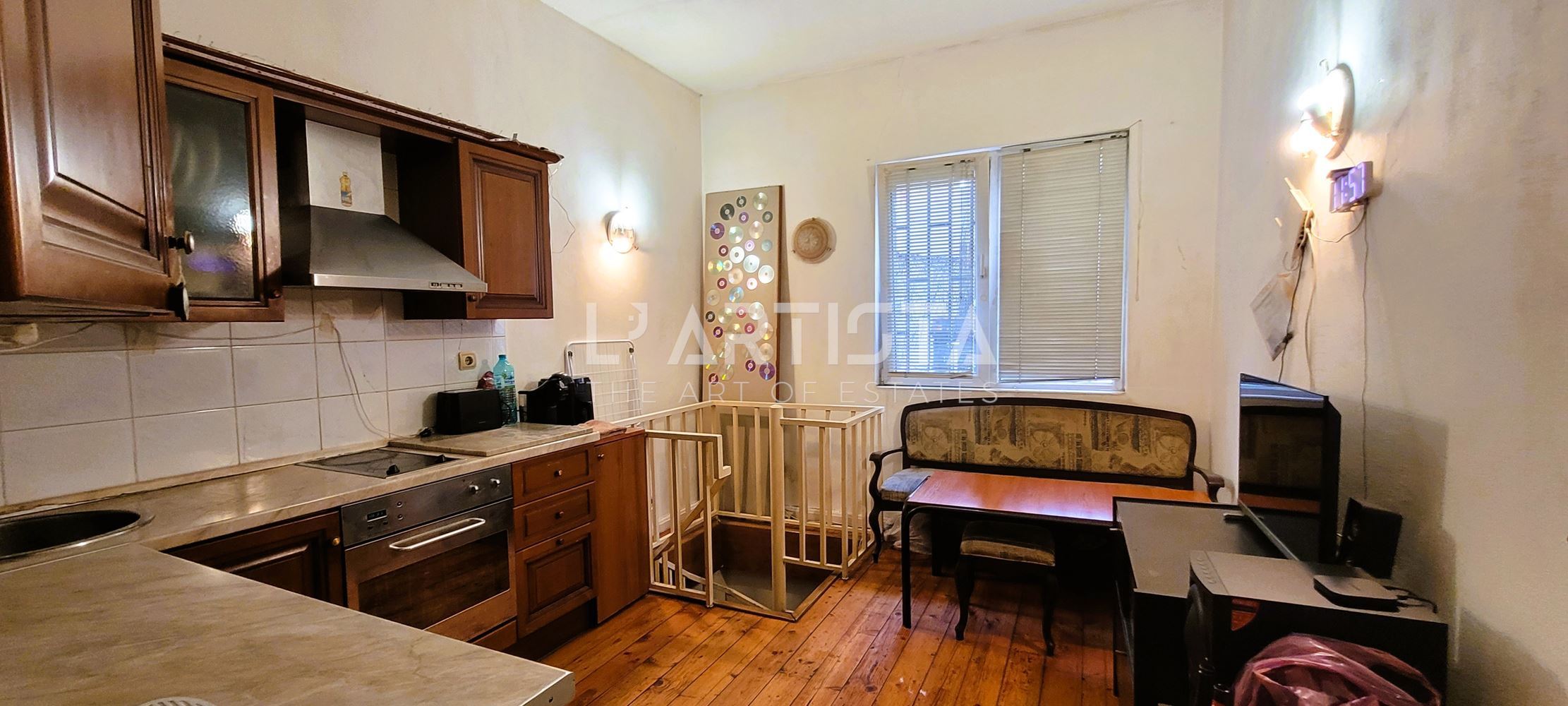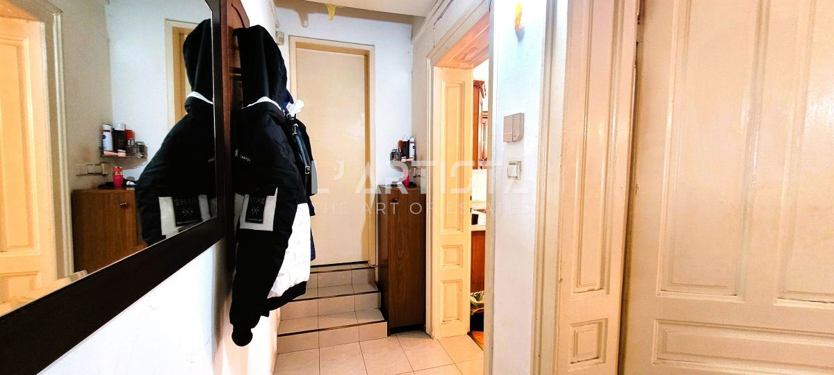 Състои се от: коридор, кухненски бокс с трапезария и вито стълбище към една преходна спалня/14кв.м./ в сутерена, голяма дневна /около 25кв.м./ и баня с тоалетна. Без балкон. Жилището е с високи тавани и големи прозорци.Имотът е за ремонт и се продава частично обзаведен с кухня и вградени електроуреди. Има възможност за преустройства. Отопление и топла вода на ток. Към имота има идеални части от дворното място.