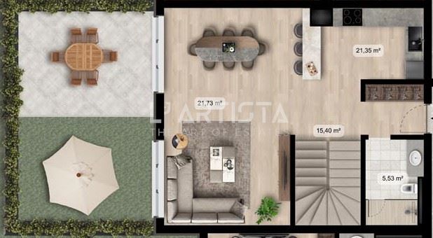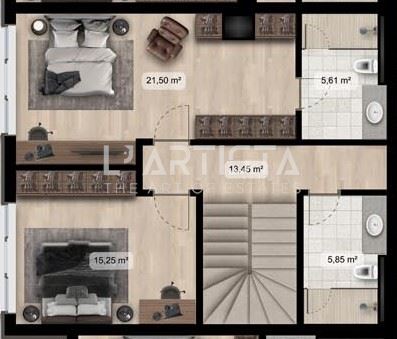 L’ Artista продава тристаен мезонет с двор, със застроена площ от 146,88 кв.м.(194.21кв.м. с об. части). Състои се от: Първо ниво – коридор, стълбище /15,23 кв.м./ дневна с кухненски бокс /43,08 кв.м./ и двор /38,35 кв.м./, баня с тоалетна. Второ ниво: коридор /13,45 кв.м./ спалня №1 /15,25кв.м./, баня с тоалетна /5,85 кв.м./ спалня №2 /21,67кв.м./, баня към спалнята/ 5,61кв.м./.Изложение северозапад.