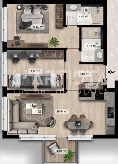 L’ Artista продава тристаен тухлен апартамент със застроена площ от 92,82 кв.м.( 122,68 кв.м. с общ. части).