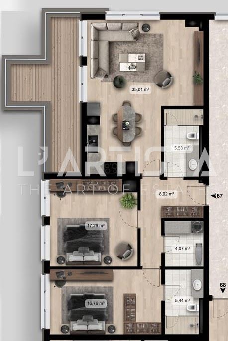 L’ Artista продава тристаен тухлен апартамент със застроена площ от 110,89 кв.м.( 146,57 кв.м. с общите части).Състои се от: коридор, дневна с кухненски бокс и тераса / 19,45 кв.м./, две спални и три бани с тоалетни. Изложение северозапад.