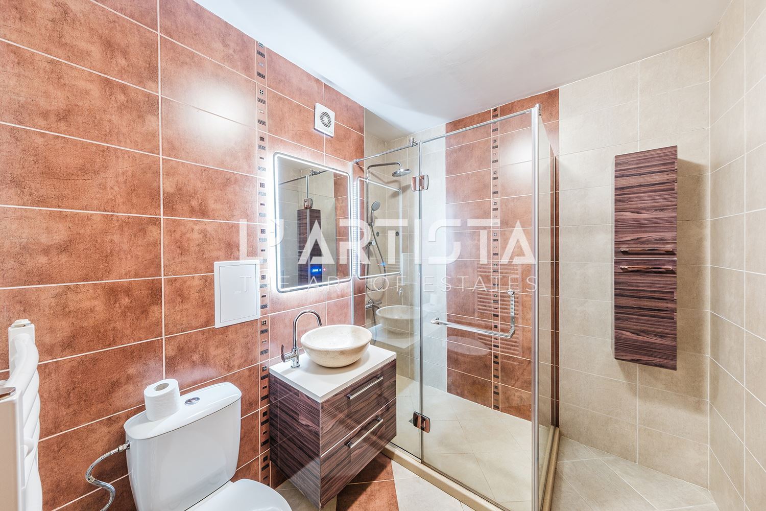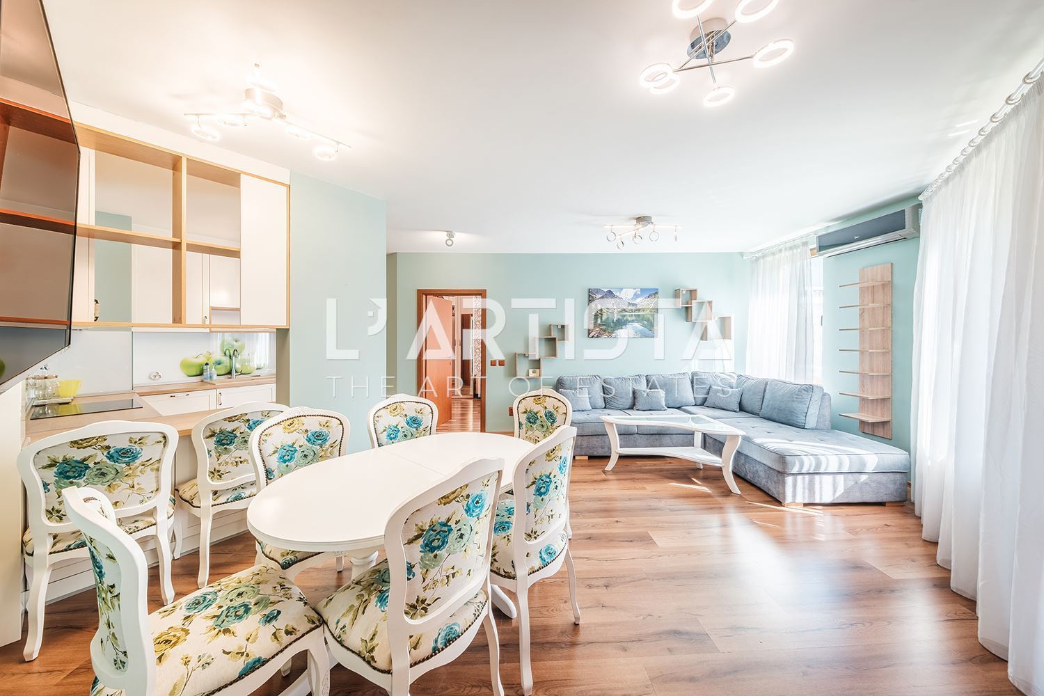 L’Artista представя напълно обзаведен тристаен апартамент, разположен в престижния и отлично поддържан затворен комплекс „Глория Палас“ в кв. Горна баня