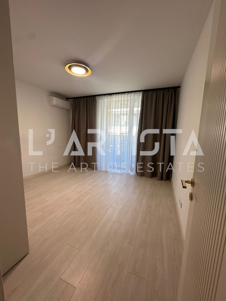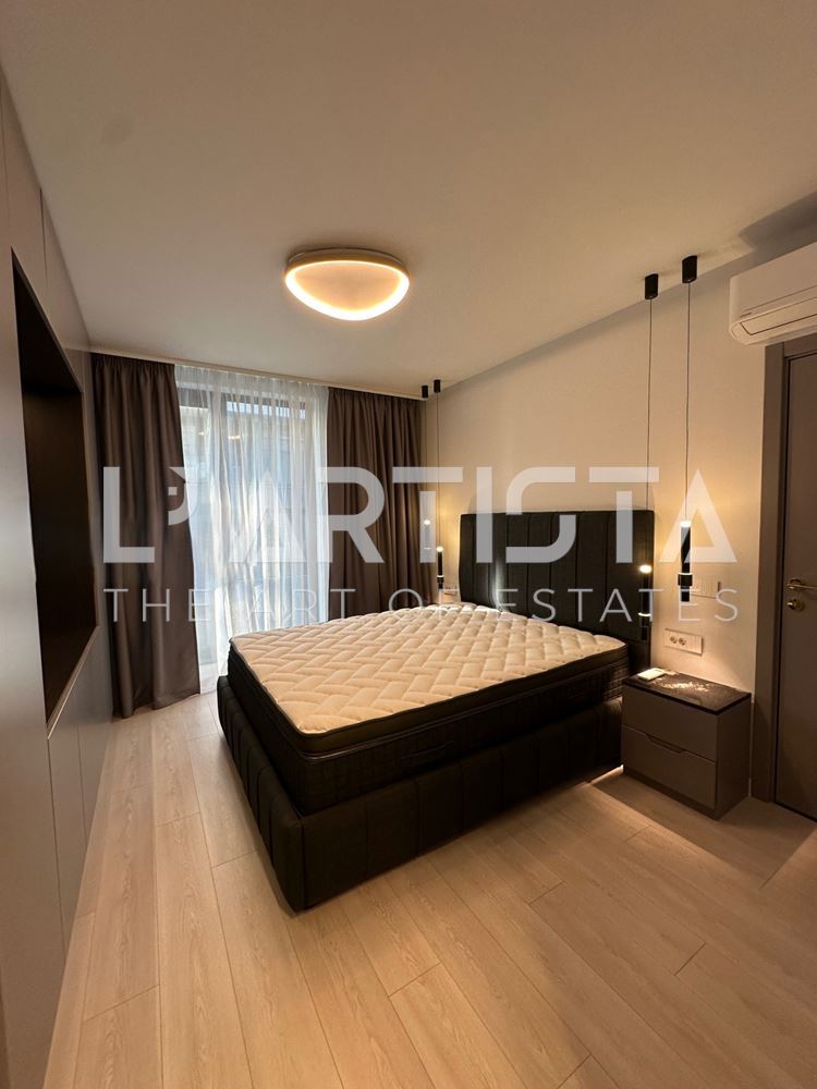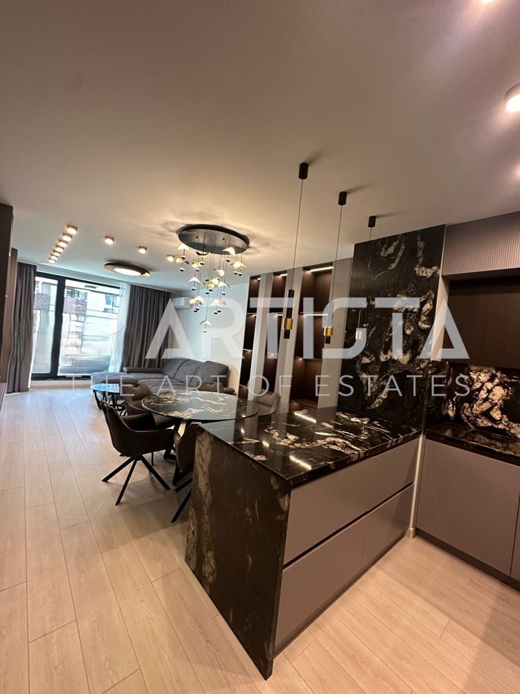 Дневната зона е светла и просторна, с френски прозорци, дизайнерско обзавеждане и напълно оборудвана кухня с висок клас електроуреди.