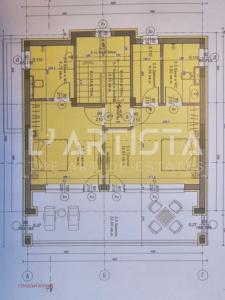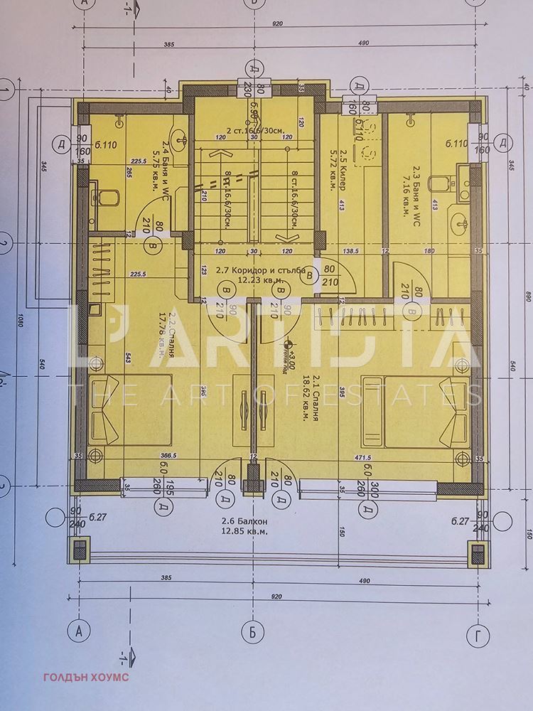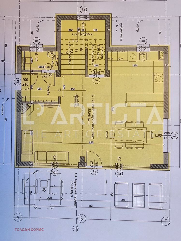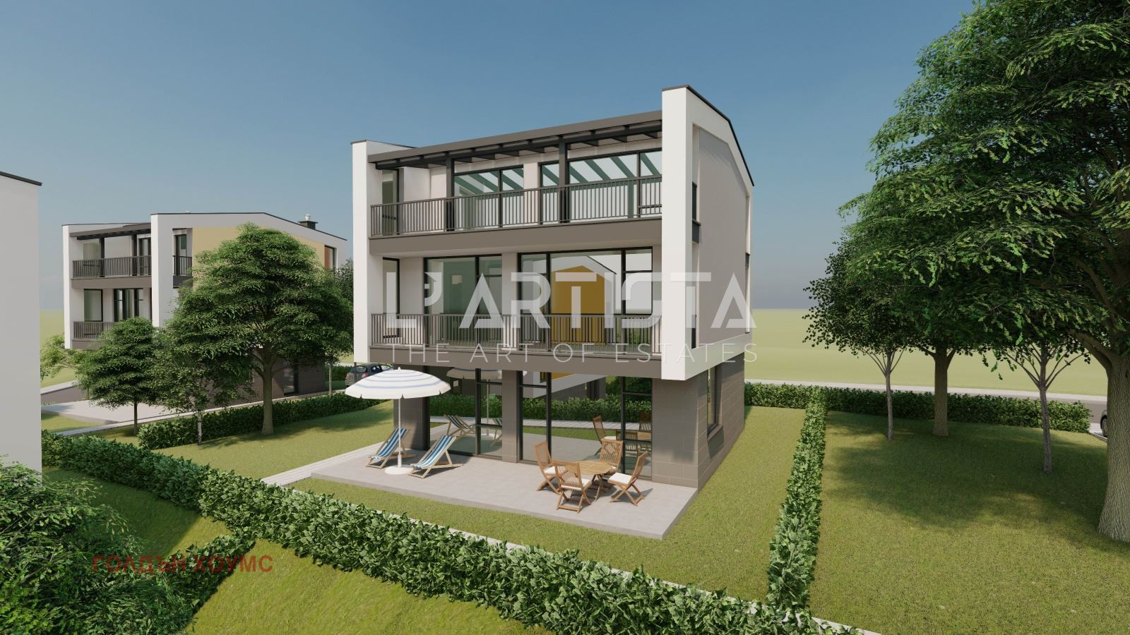 Къщата на нивото на терена има просторна дневна с кухненски бокс , фоайе със санитарен възел и килер . На горните две нива има общо 4 спални и 4 бани. Площта на къща е разпределена , както следва :