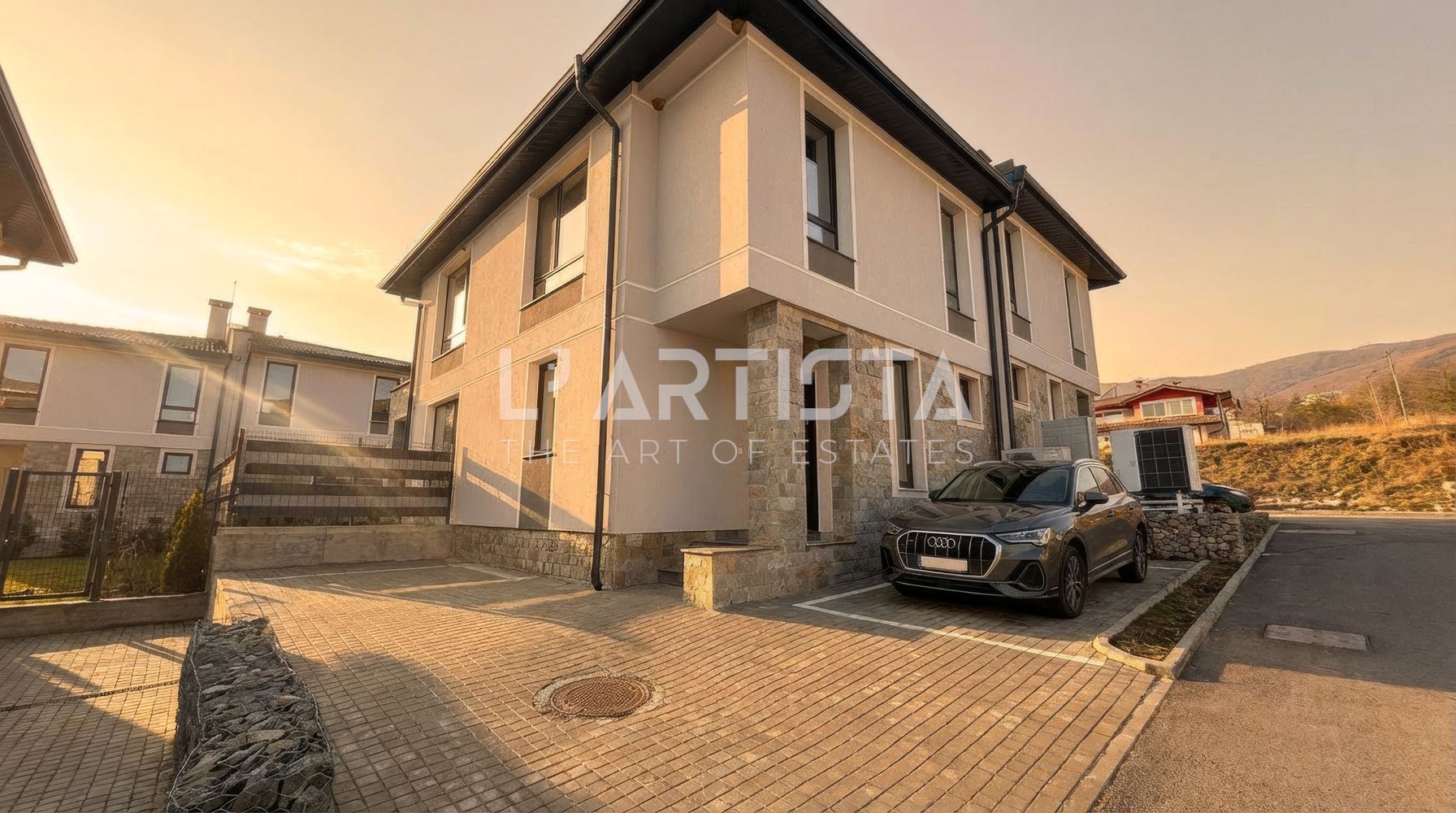 Предлагаме за продажба къща близнак, с РЗП 270 кв.м, от които 90кв.м сутерен. Разположена в малък затворен комплекс от 11 къщи, в полите на Витоша, този имот предлага спокойствие, сигурност и усещане за истински семеен дом.