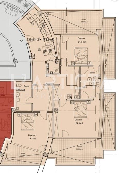 Чиста площ на апартамента без покривните тераси е 243 кв.м., 184 кв.м тераси, 49 кв.м общи части.
